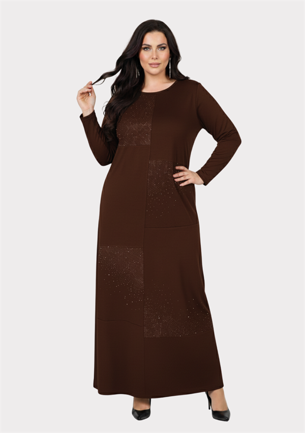 Kadın Büyük Beden Kahve Rengi Uzun Kollu Taş Detaylı Elbise