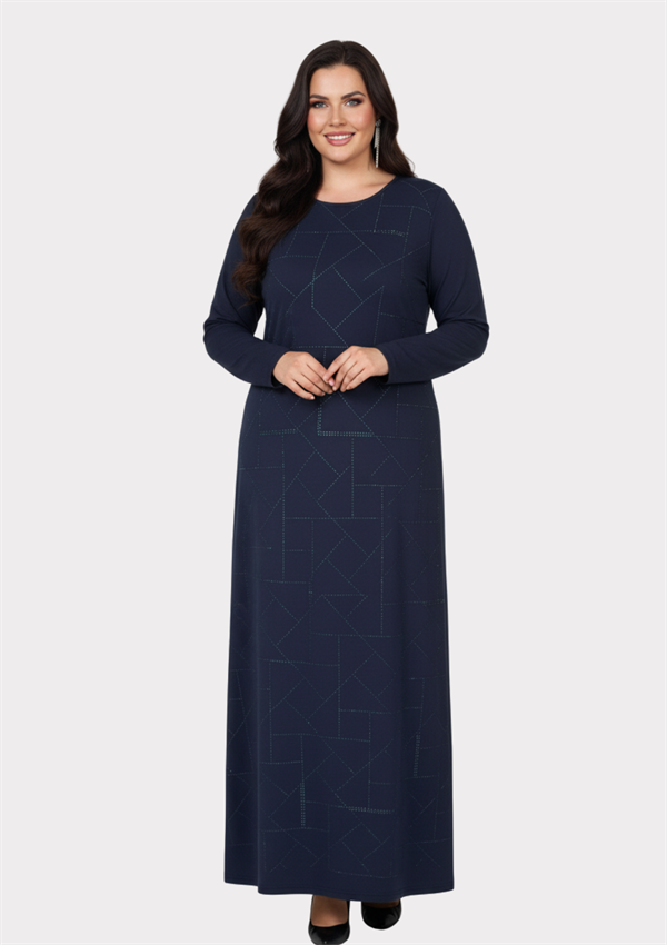 Kadın Büyük Beden Lacivert Geometrik Taş Detaylı Elbise